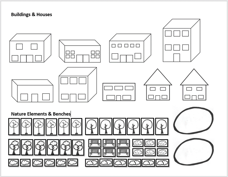 - Draw buildings/houses and any nature elements