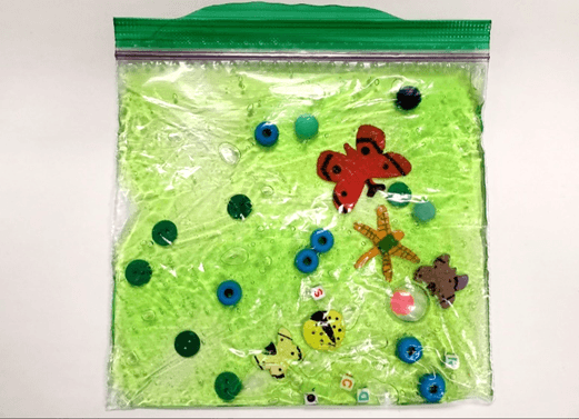 - Fill sandwich bags or containers with sensory materials including small round objects