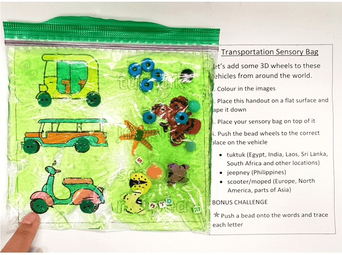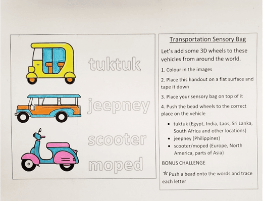 Participants can colour in and decorate the vehicles on the Transportation Sensory Bag handout. Then they will create a sensory bag with gel, a sandwich bag, and beads and various tactile objects—some of which will serve as the wheels for the vehicles. Placing the sensory bag over the handout, participants must move the wheels into the correct place on the handout.