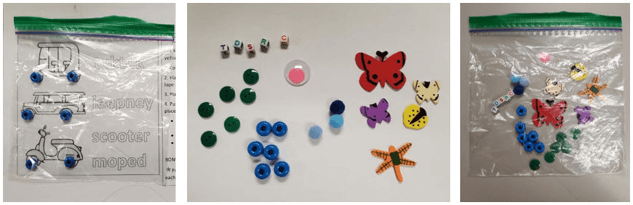 - Choose six pieces of an item to serve as vehicle wheels (e.g., pony beads) and then select other small tactile items, including additional round items, to add to the bag